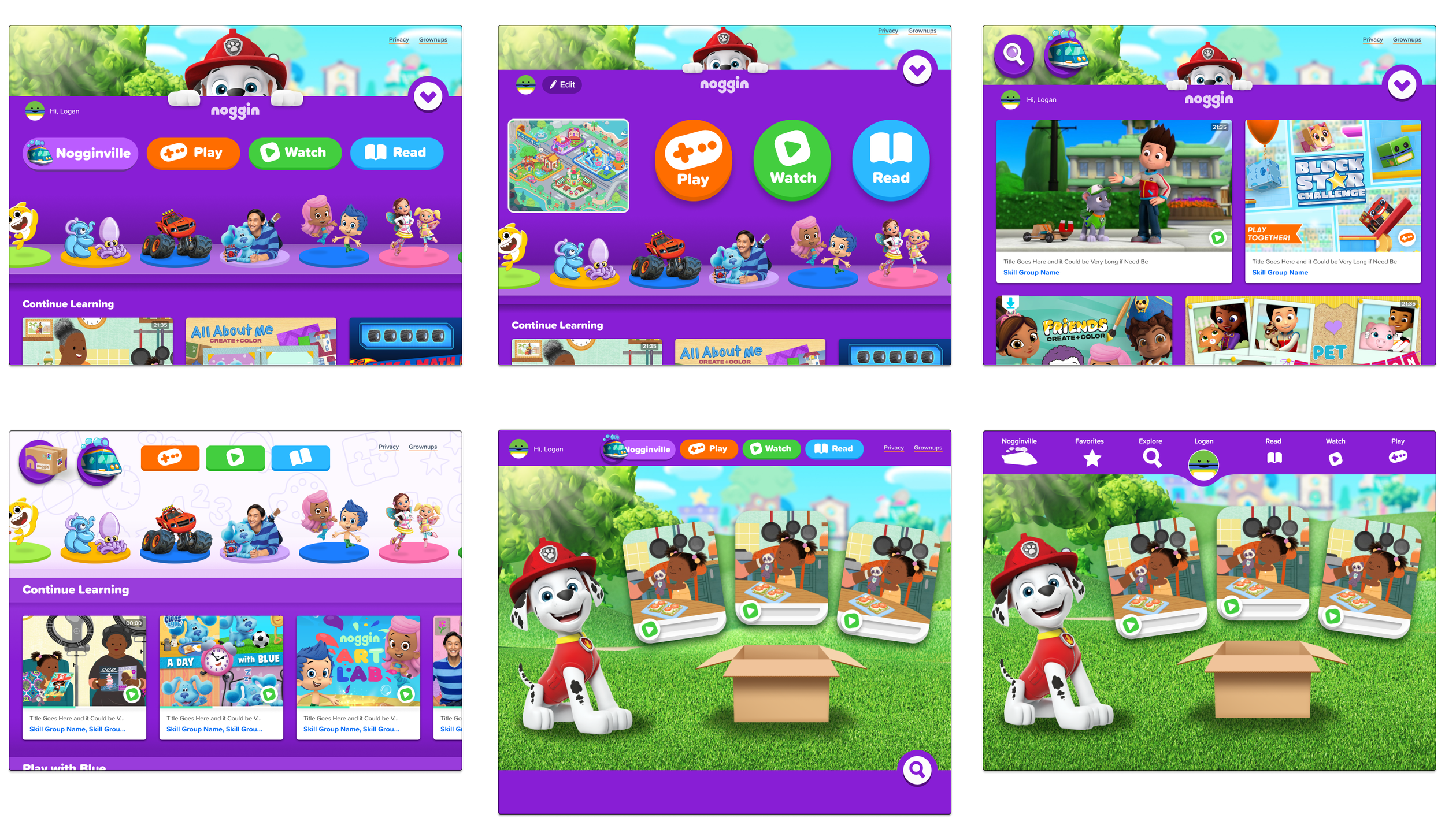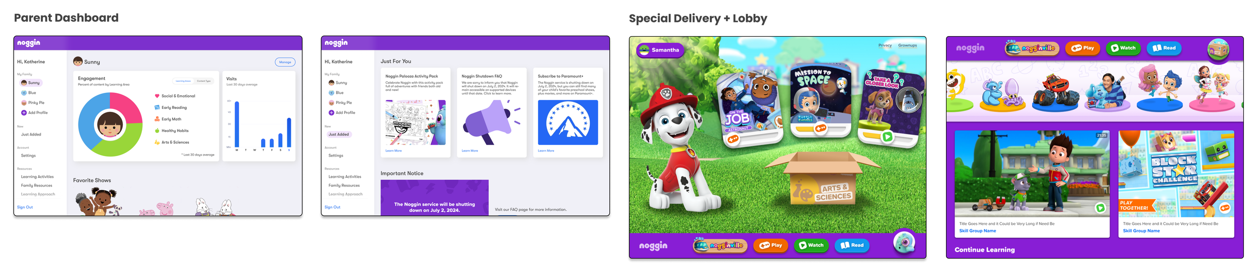 Noggin↗ (Paramount) wanted to redesign the kids app lobby and parent dashboard experience to better showcase its educational (non-video streaming) content.