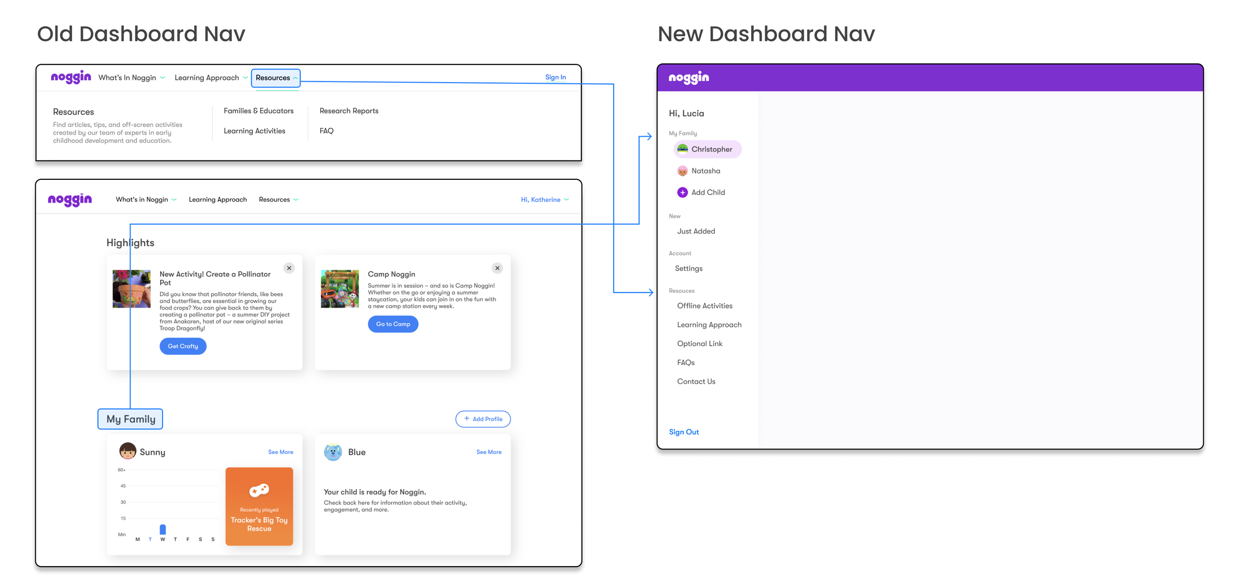 Previously, the old dashboard was confusing to parents because the navigation made it seem like they haven’t signed in at all. The top nav bar remained the same as the Noggin informational homepage before they signed in.